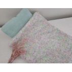 * une couverture réversible liberty / double gaze de coton céladon étoiles or, 28x40, avec passepoil or irisé tout autour
