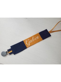 Jolie attache-tétine réalisée avec des cotons aux couleurs très modes en marine et moutarde.