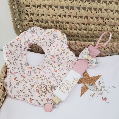 Jolie attache-tétine réalisée avec un matelassé blanc, coton vieux rose pois or et un petit noeud du sublime liberty Theo rose