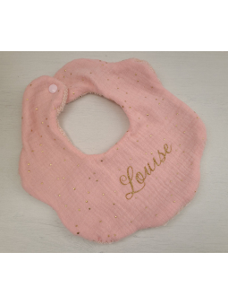 Bavoir fleur personnalisé en double gaze de coton rose poudre confettis or doublé d'éponge rose poudre toute douce. fermeture pression très pratique !