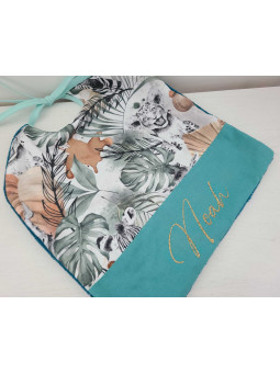 Joli bavoir réalisé avec un très beau coton sur le thème jungle, associé à un coton bleu canard. Il est personnalisé avec le prénom en flex or et doublé d'éponge de bambou bleu canard bien douce et épaisse.