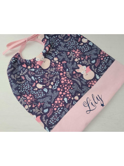 Joli bavoir réalisé avec un très beau coton sur le thème de petits renards, associé à un coton rose uni. Il est personnalisé avec le prénom en flex marine pailleté et doublé d'éponge de coton rose bien douce et épaisse.