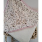 Belle cape de bain 70x70 cm réalisée en éponge écrue douce et épaisse et un joli coton floral , biais rose poudré tout autour et possibilité de personnaliser la cape en flex assorti avec le prénom