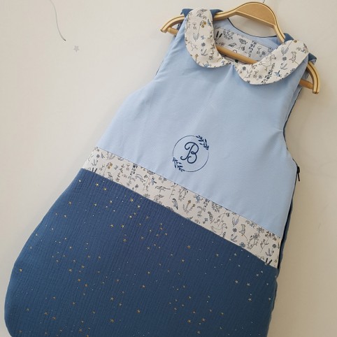 Superbe gigoteuse toute mignonne sur le thème marin réalisée avec un coton rayé bleu et blanc et un marine uni.