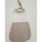 Cette gigoteuse 0-6 m est un petit cocon de douceur, réalisée avec un piqué de coton blanc associé à de la double gaze taupe clair confettis or
