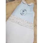 Cette gigoteuse 6-24 m est un petit cocon de douceur, réalisée avec le liberty Theo blue dust, associé à du piqué de coton bleu ciel et de la double gaze bleu ciel. Joli col claudine et l'initiale joliment présentée dans une couronne de feuillages ;)