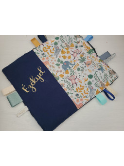Plein d'étiquettes assorties aux couleurs et textures variées pour éveiller les sens de Bébé: gros grain, organza, satin, ruban à message, coton enduit ... et doublé de tissu tout doux minkee marine.