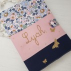 Adorable protège carnet de santé réalisé le sublime liberty Betsy denim associé à du marine uni et vieux rose pois or.