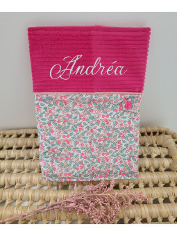 Adorable protège carnet de santé réalisé avec 2 cotons : velours fushia uni et le superbe liberty Colleen, très pep's !