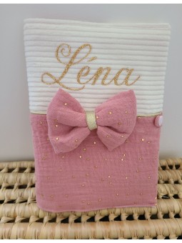 Celui-ci est réalisé avec un velours écru et une double gaze vieux rose confettis or; passepoil doré pour une jolie finition.