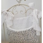Magnifique range-pyjama (ou doudous) à accrocher aux barreaux du lit de Bébé avec de gros noeuds en double gaze blanche confettis or. Cette création est matelassée pour une meilleure tenue