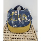 rabat avec un très beau coton petits animaux de la forêt, soufflet avec le même coton, tout passepoilé, pressions pour le fermer et pour raccourcir les bretelles !