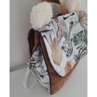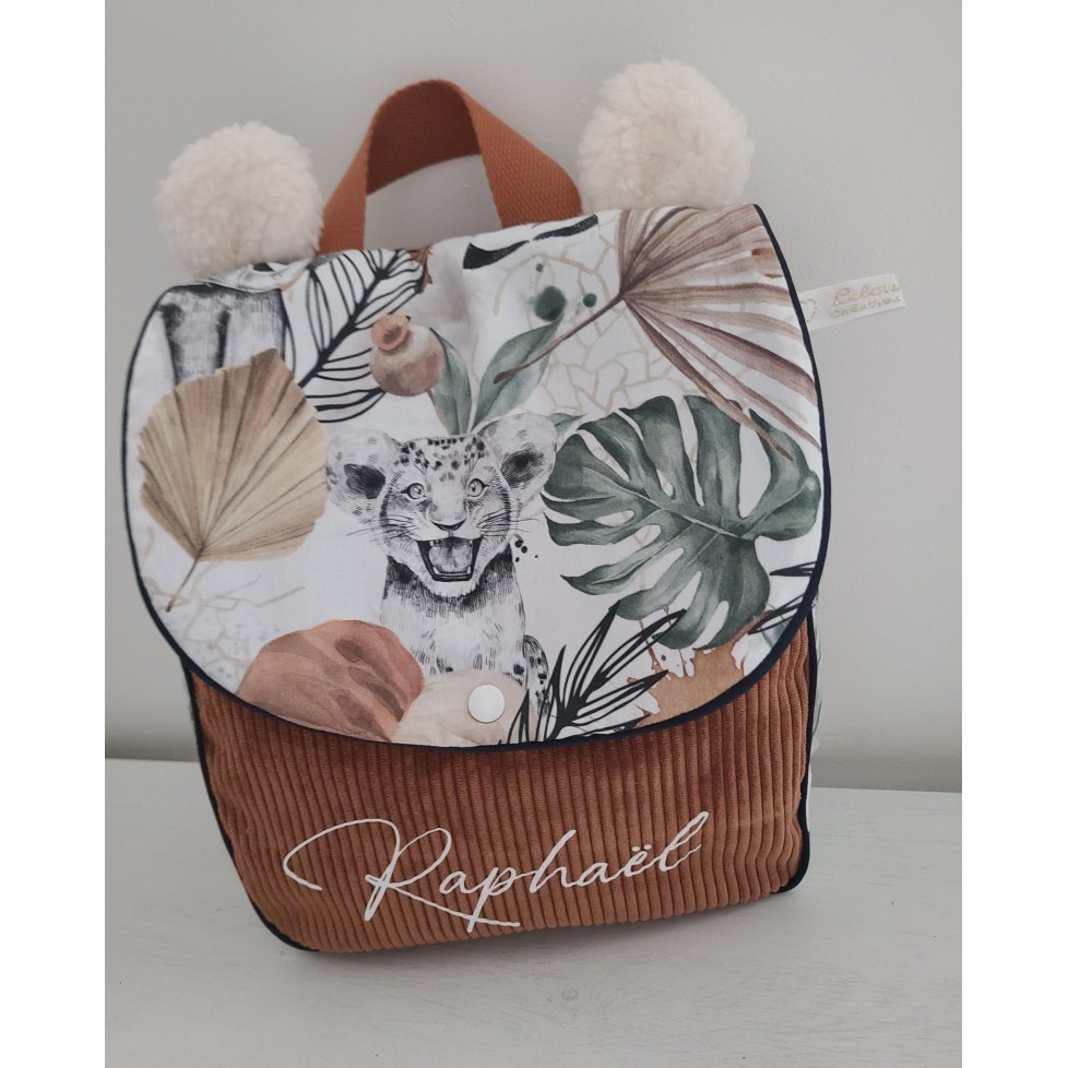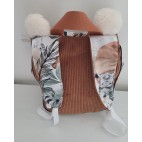 Soufflet, anses et rabat dans un joli imprimé jungle ... et corps du sac en velours marron, de jolies petites oreilles, tout passepoilé or pour des finitions parfaites, pressions pour le fermer et pour raccourcir les bretelles !